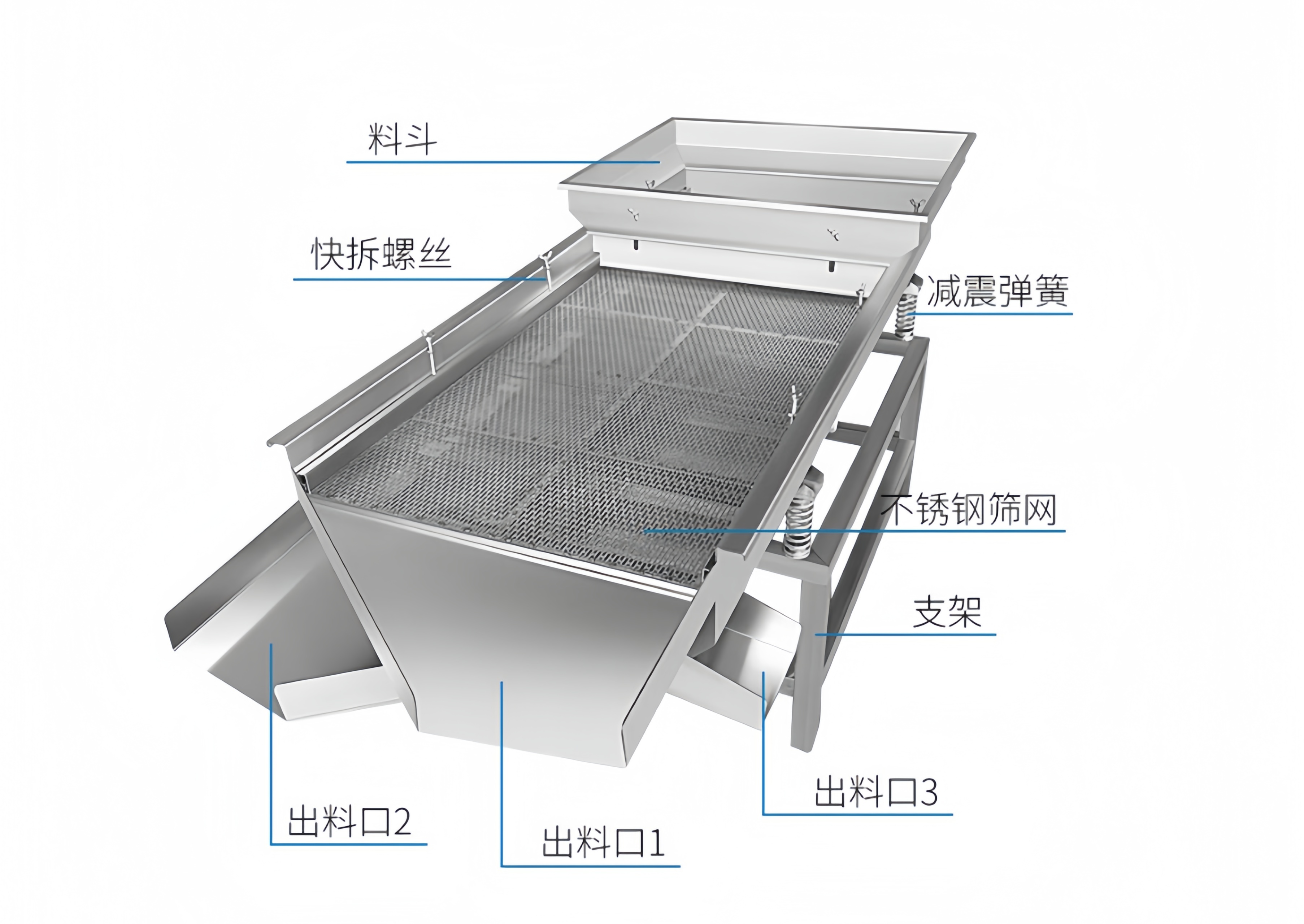 黄豆直线振动筛整体结构设计简约紧凑、模块化组装成型,全机主要由核心振动电机、筛网、分层筛网托架、减震支撑装置、进出料导流口以及机架防护外壳等部件组成,整体布局合理稳固,拆装检修便捷。两台振动电机对称卧式安装在筛箱底部,作为设备专属激振动力源;筛箱采用加厚碳钢或304不锈钢材质焊接成型,坚固耐用不易变形;筛网可根据黄豆筛分需求灵活更换不同网孔规格,搭配专用卡扣拉紧固定,防跑偏、防堵网;底部配备高强度弹簧减震支座,有效缓冲设备运行振动,降低设备噪音与地面震动影响。